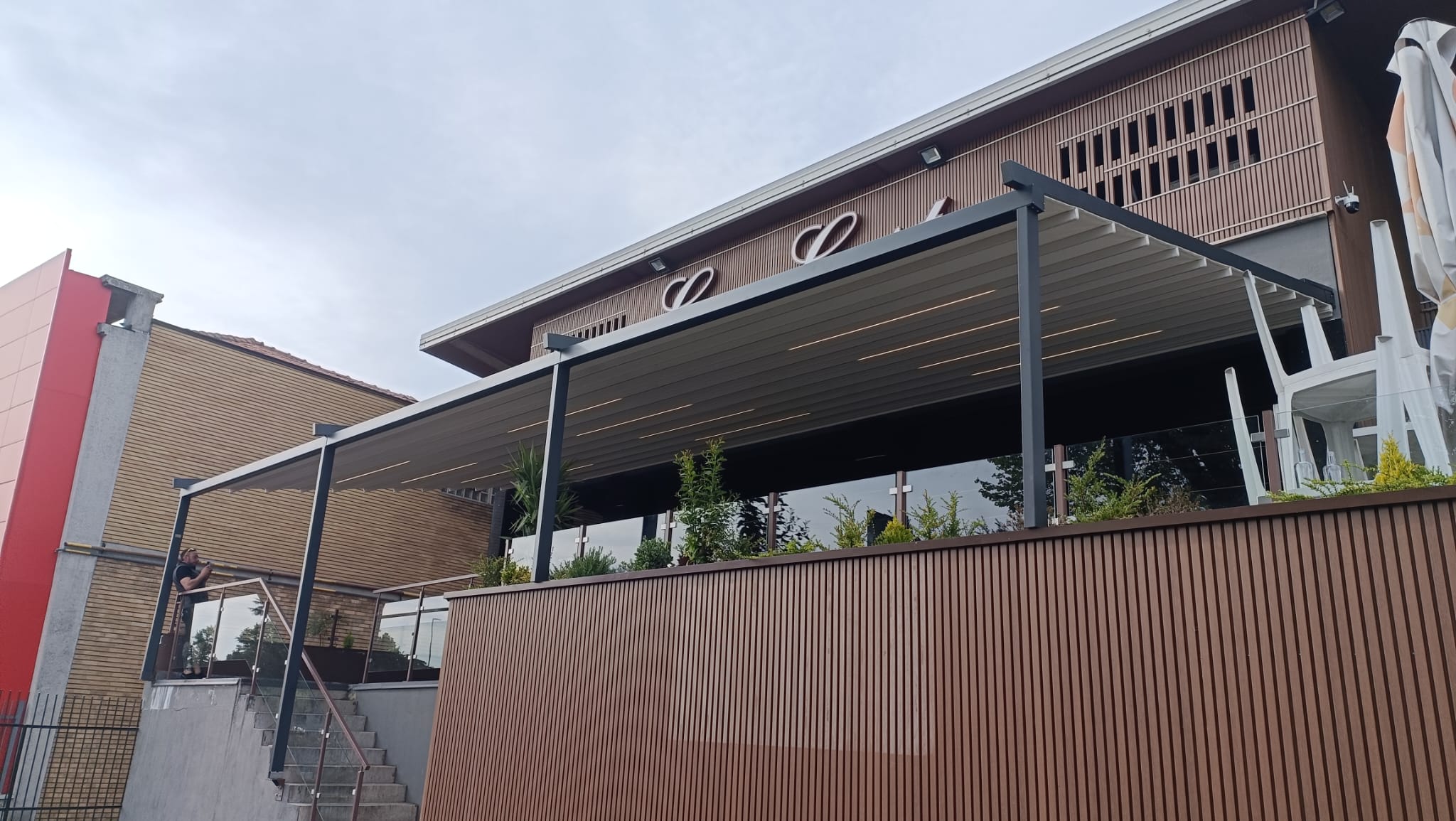 Pergole Pergola bioclimatica BRERA S Grigio Sablè con lamelle apribili e LED a luce bianca – Villa con giardino, Monza