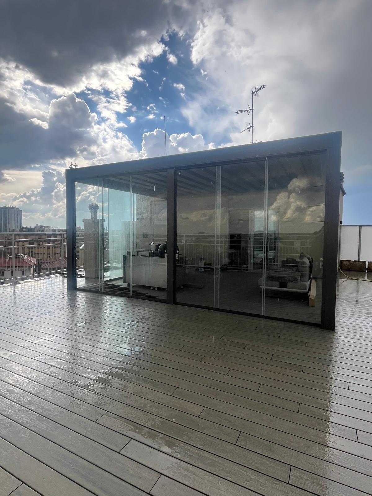 La struttura è stata completata con raso dotato di tessuto oscurante, pensato per aumentare il comfort nelle ore più luminose e garantire una gestione più efficace di luce e calore. A valorizzare ulteriormente il progetto, le vetrate scorrevoli Slide Glass VEPA, che consentono di chiudere lo spazio mantenendo luminosità e continuità visiva, trasformando il terrazzo in un’area protetta e fruibile in più stagioni.